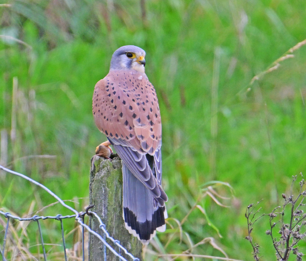 Der männliche Turmfalke hat einen Nager erbeutet